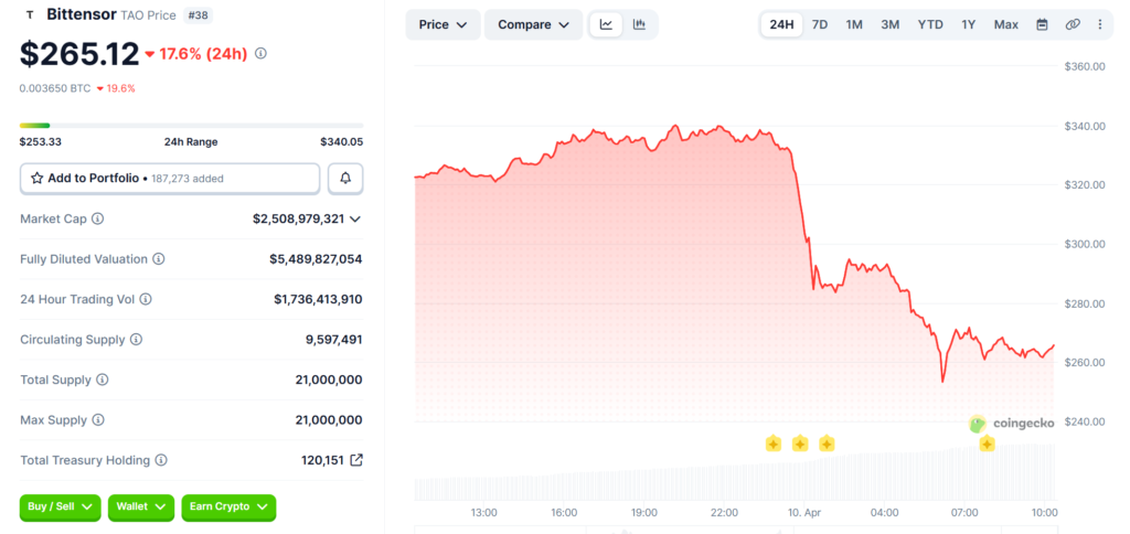 TAO dropped more than 15% immediately following the announcement, sliding from around $337 to $284 according to CoinGecko. By press time the token had extended its losses. CoinMarketCap data shows TAO trading at approximately $262.70, an 18.80% decline in 24 hours and a 14.65% drop over seven days. Market capitalisation stood at roughly $2.5 billion against a circulating supply of 9.6 million TAO, while 24-hour trading volume surged past $1.73 billion, rising approximately 156% as investors moved to exit positions.