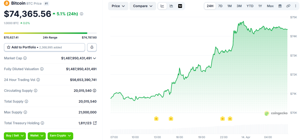 At the time of writing, BTC is trading at approximately $74,363, up 5.08% in the past 24 hours, with a market cap of $1.49 trillion and 24-hour trading volume of $56.65 billion.