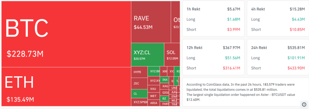 Bitcoin moved from a morning low of $70,741 to intraday highs above $74,900 within hours. Analysts had flagged a large cluster of leveraged short positions stacked in the $72,000–$73,500 range, and once prices pierced that band, liquidations accelerated the move sharply upward. Of the $530 million in total liquidations, roughly $425 million, or 80%, were leveraged short positions on Bitcoin and Ether, according to CoinGlass data.