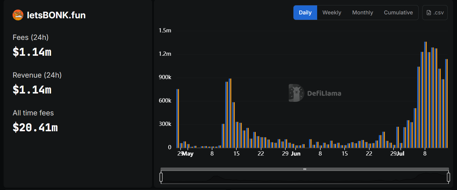 While Pump.fun has been a household name for Solana memecoins, LetsBonk.fun has just surpassed Pump.fun as the dominant token launchpad on the Solana blockchain. LetsBonk.fun’s daily revenue exceeds $1 million. LetsBonk.fun collected $7.97 million in revenue recently, topping all other Solana launchpads combined.