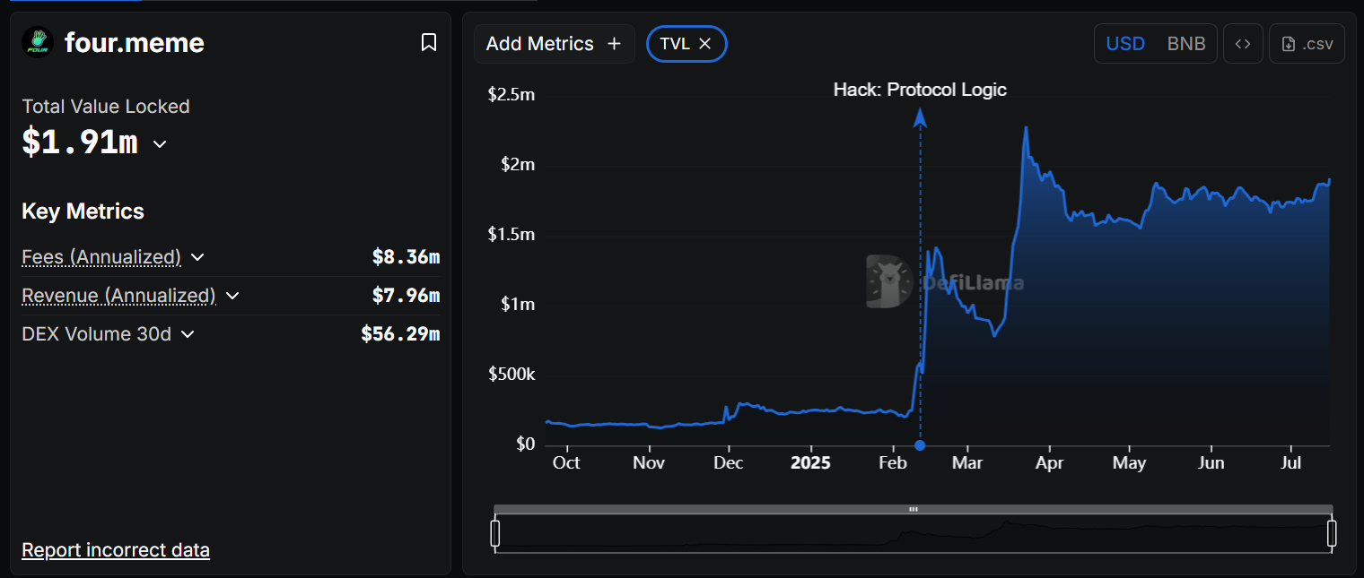 The current market cap of Four.meme is $93.72 million. The annualized fees of Binance’s memecoin launchpad is $8.36 million and its annualized revenue is $7.96 million.