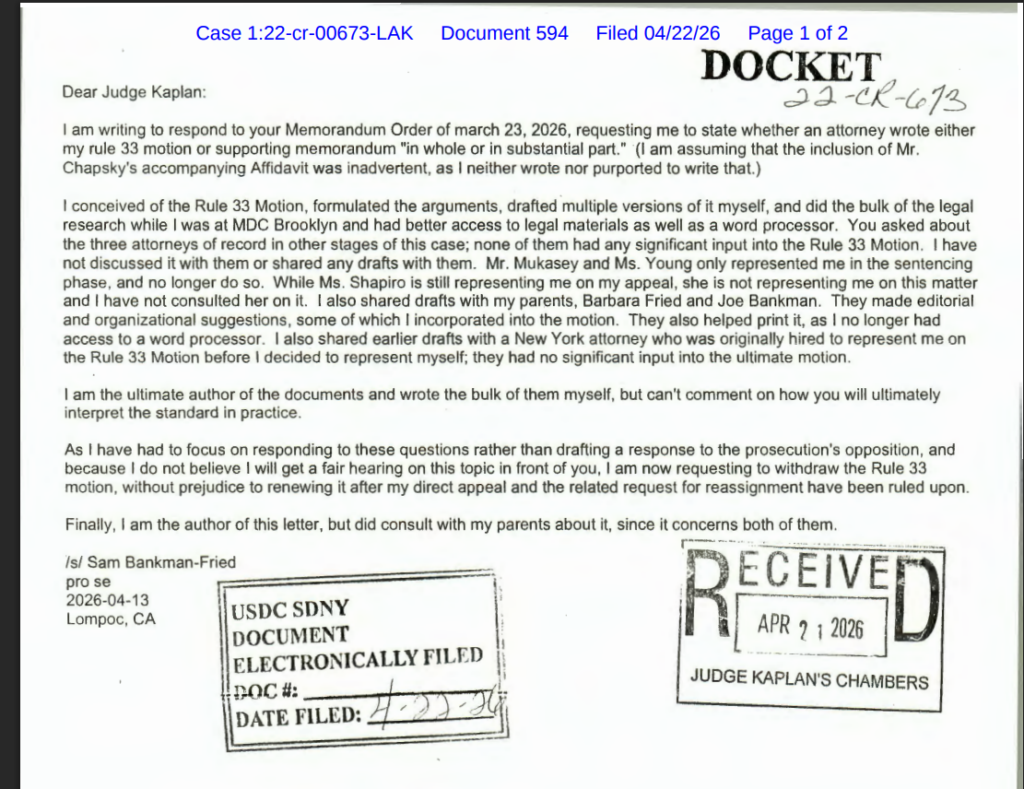 In a letter filed on April 22 in the US District Court for the Southern District of New York, Bankman-Fried formally pulled his Rule 33 motion, a legal request for a new trial based on allegedly newly discovered evidence, but made clear the decision was a tactical pause, not a surrender.