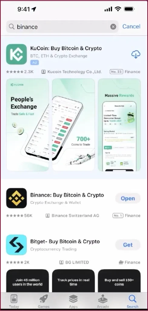 Search ‘binance’ in the App Store, Binance appears as the top Finance app