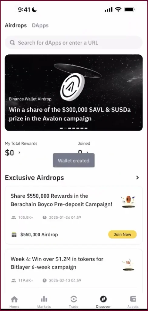 Tap the Discover tab at the bottom of the wallet screen. You will see two sub-tabs: Airdrops (campaigns where you can earn free tokens) and DApps (the browser for decentralised applications).