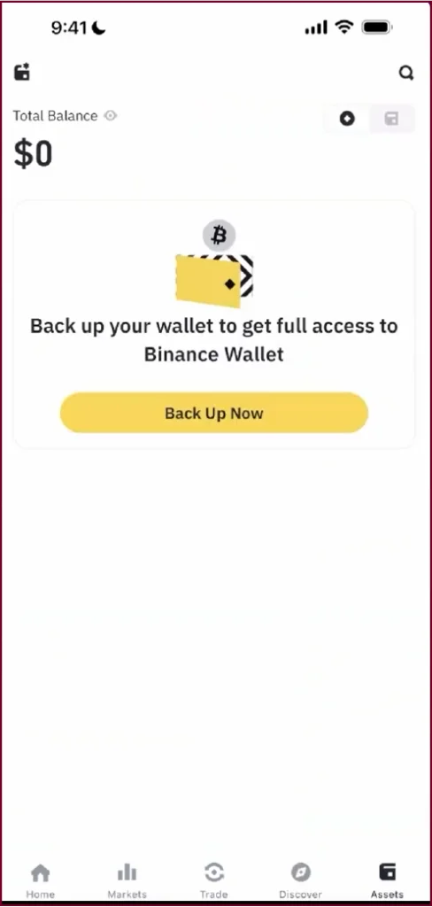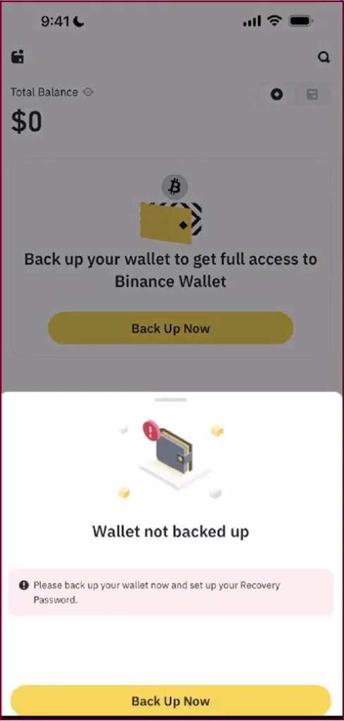 As soon as the app creates your wallet, it will ask you to back it up. You will see a screen showing your wallet balance at $0 with a clear message: ‘Back up your wallet to get full access to Binance Wallet.’ Tap Back Up Now.