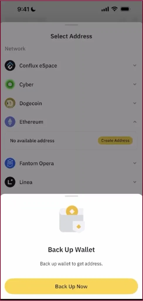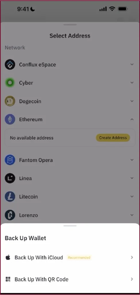 When you tap Back Up Now, you will see your wallet’s supported blockchain networks listed. Scroll to find the one you want to create an address for (for example, Ethereum or BNB Chain) and tap Create Address. This will trigger the backup flow.