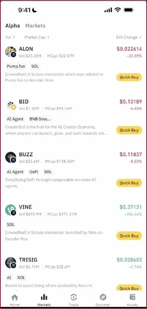 The wallet also integrates directly with the Alpha Markets section, where you can discover trending on-chain tokens, view live price charts, and tap Quick Buy to purchase tokens directly. This is useful for finding early-stage tokens across chains like Solana and BNB Smart Chain.