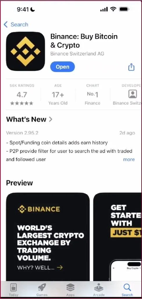 The official Binance app listing, tap ‘Open’ if already installed, or ‘Get’ to download
