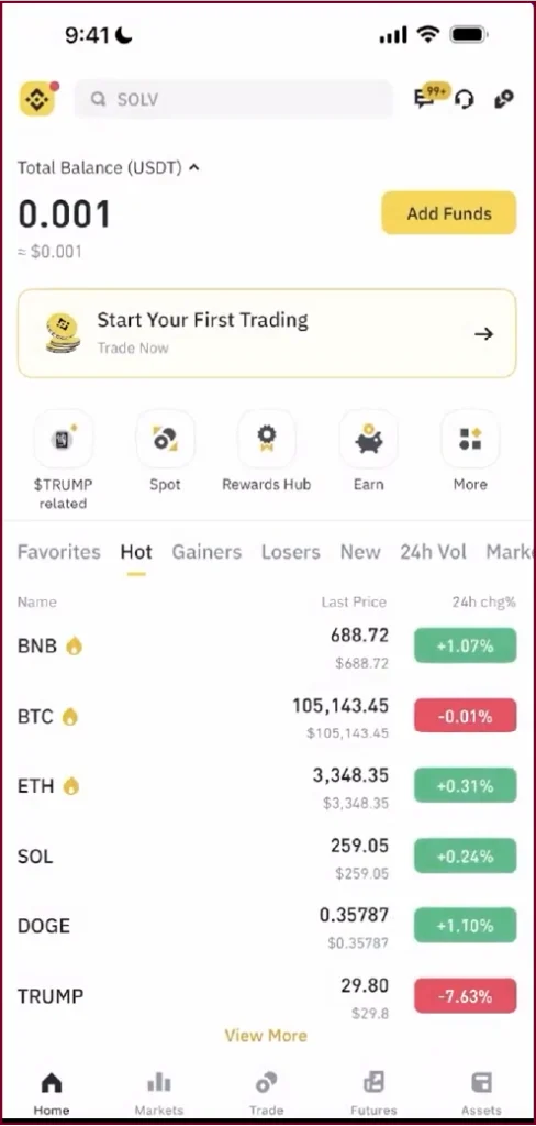 The Binance app home screen after logging in, your starting point
