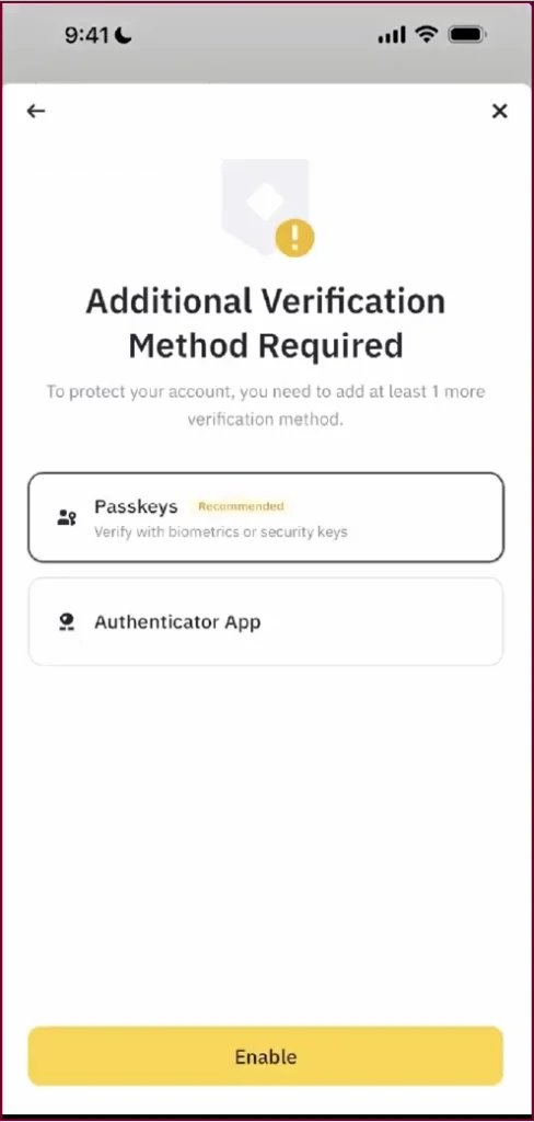 You will be asked to add another verifying method to secure your wallet after tapping on Create Wallet. You’ll have two options to select from – Passkeys, which is recommended and uses biometrics like Face ID or fingerprint or Authenticator App. Choose your desired method and press Enable.