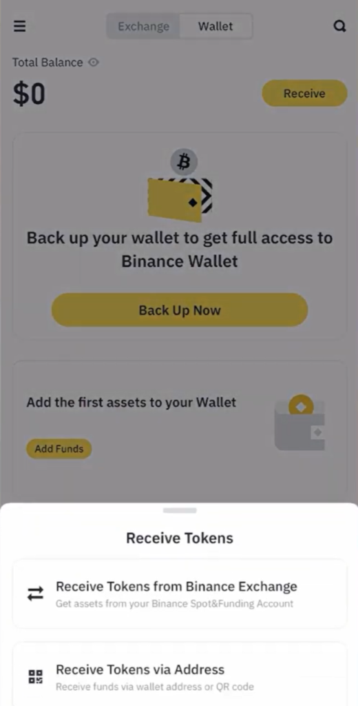 Your wallet starts with a $0 balance. The easiest way to fund it is by receiving tokens directly from your Binance exchange balance. Tap the Receive button on your wallet home screen.